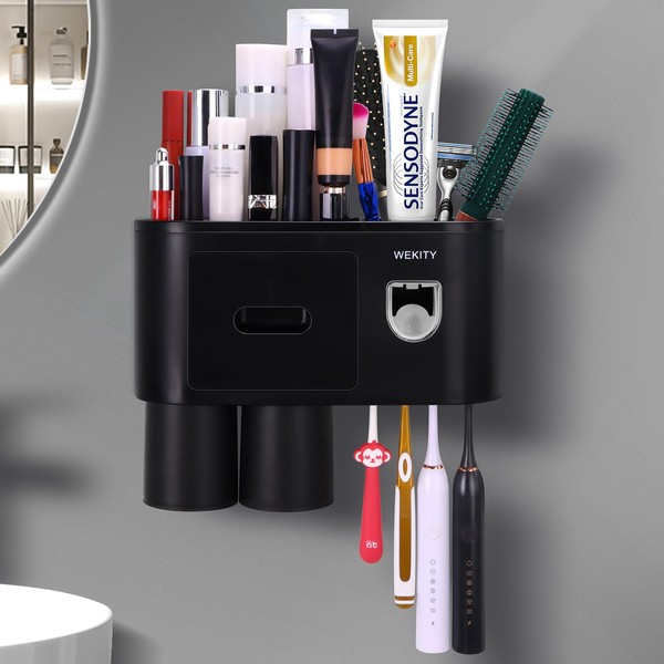 Wekity Multifunctional Wall-Mounted Toothbrush Holder, Automatic Toothpaste Dispenser Space Saving Toothbrush and Toothpaste Holder, with 2 Cups and Drawers Cosmetic Organizer (Black)