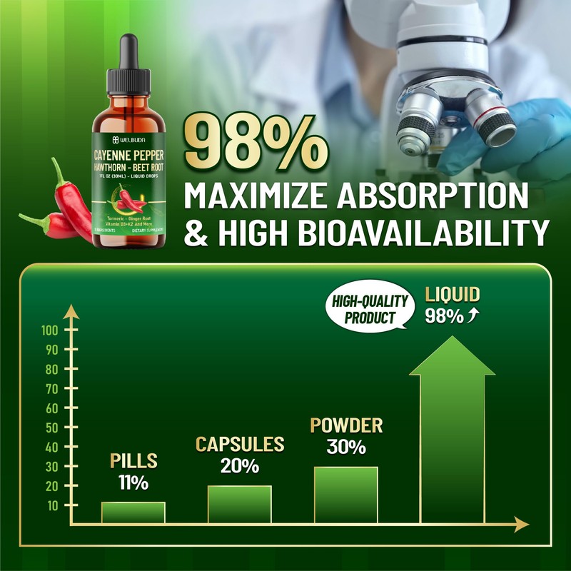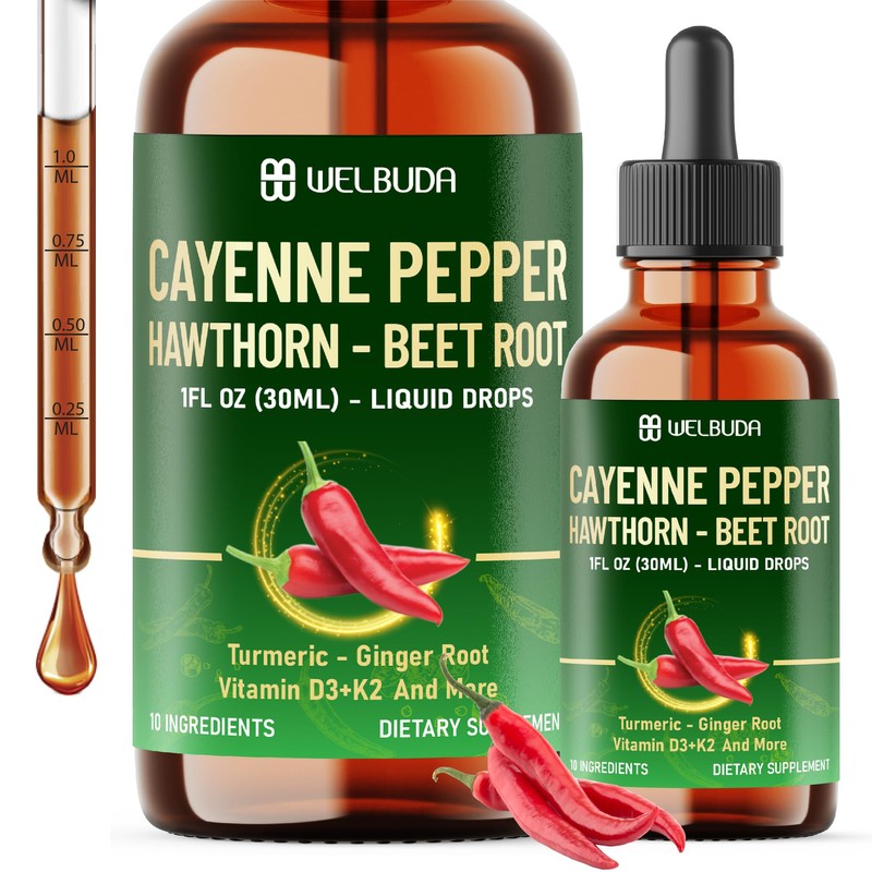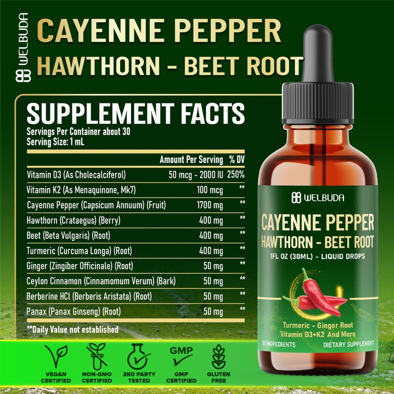 WELBUDA Cayenne Pepper Liquid Drops with Vitamin D3, Vitamin K2, Hawthorn Berry, Beet Root, Turmeric, Ginger, Ceylon Cinnamon, Berberine - Digestion Support - 30ml