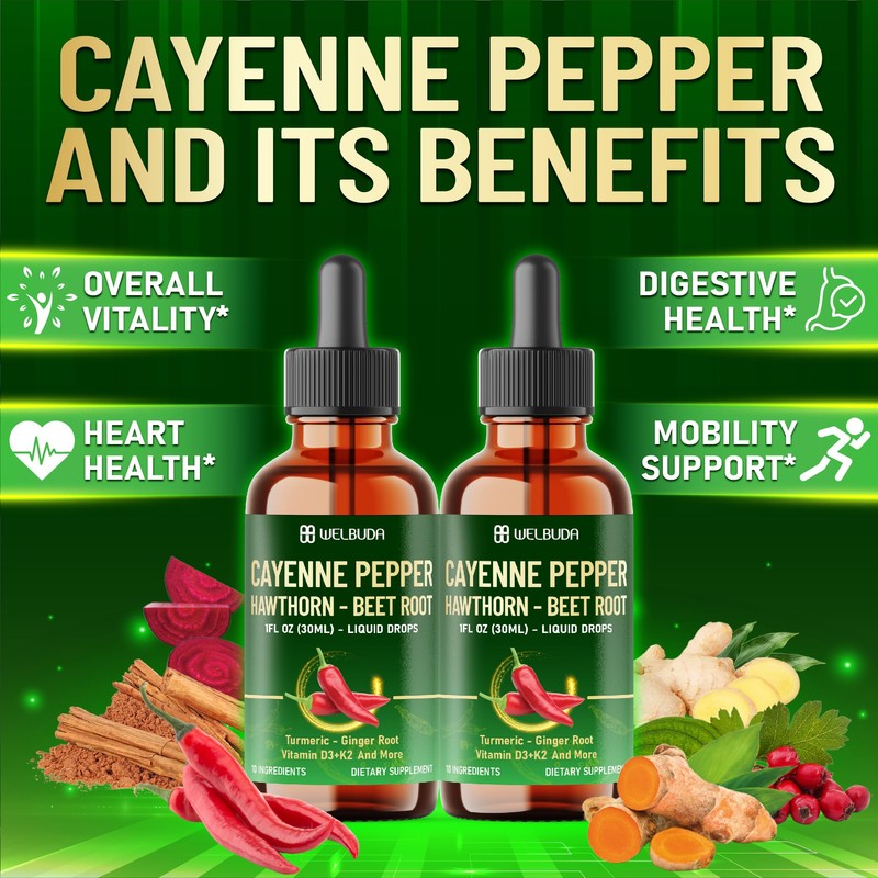 - Wellness Support: 10 in1 Cayenne Pepper Liquid Supplement blends essential vitamins and herbal extracts like Vitamin D3, K2, cayenne pepper, and hawthorn berry to support Overall vitality, Digestive health and Heart health.