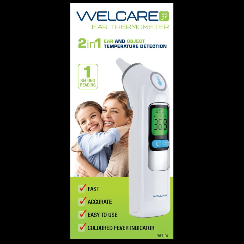 Get fast and accurate temperature readings in either ear or object mode with the Welcare Ear Thermometer. This easy to use thermometer features a backlit screen with colour fever indicators in green, yellow and red, so it can be easily used at night without waking a sleeping child. 30 reading memory helps you to keep track of temperature fluctuations over time.