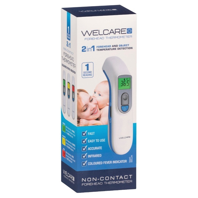 Fast and accurate non-contact temperature readings is just a second away with the Welcare Forehead Thermometer. Take measurements in either forehead or object mode quickly and easily. This simple-to-use thermometer features colour fever indicators in green, yellow and red, and is contactless so it can be easily used at night without waking a sleeping child. 25 reading memory helps you to keep track of temperature fluctuations over time.