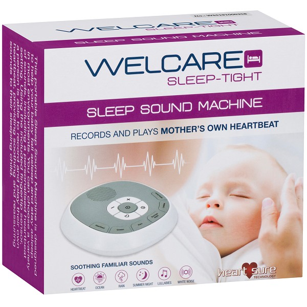 The Welcare Sleep-Tight Sleep Sound Machine records and plays Mother’s own heartbeat, in addition to playing 5 other sounds to provide a soothing familiar sound to create a comforting and consistent sound environment for a child to sleep.