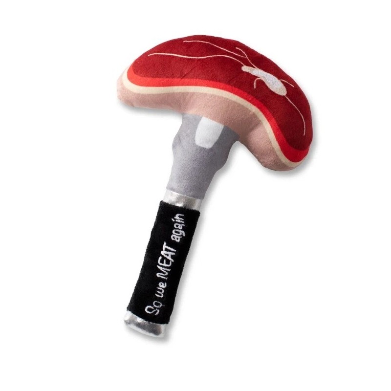 New "So We Meat Again" dog toy - from the "Chillin' & Grillin" collection. This mouth-watering, soft sueded plush toy with squeaker & crinkle is sure to be a favorite of your pup's. Measures approximately 11" x 7". A nicely made, durable play toy/buddy for your dog... not for those that are super chewers.