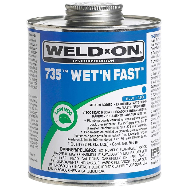 WELD-ON 12495 735 Wet 'N Fast Medium-Bodied High Strength PVC Cement - Extremely Fast Setting and Low-VOC, Blue, 1 Quart (32 fl oz)