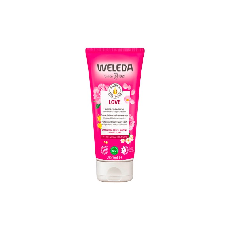 The Weleda Aroma Shower Love organic creamy bodywash pampers your senses with a fragrance with Damascus rose , jasmine and ylang-ylang . The aromatic shower cream awakens a feeling of harmony and supports your natural well-being with the power of 100% natural essential oils and plant extracts .