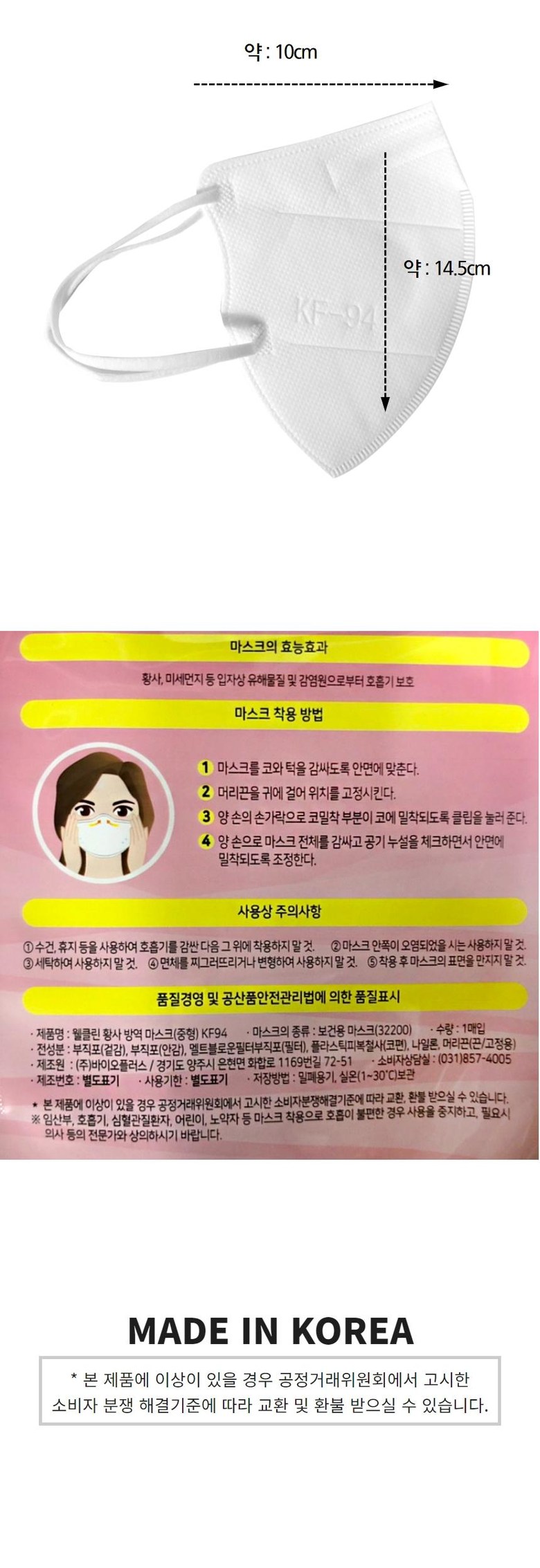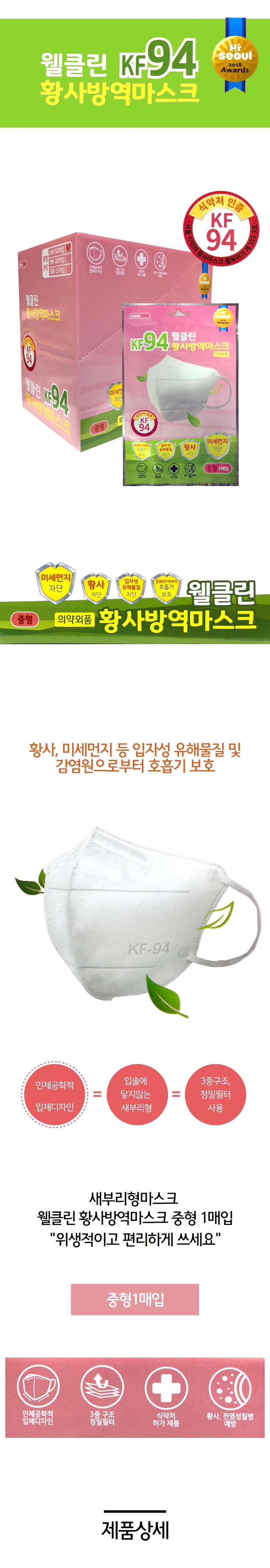 Well Clean Yellow Dust Quarantine Mask KF94 Medium White 50 sheets 1 / 웰클린 황사방역마스크 KF94 중형 화이트 50매 1개