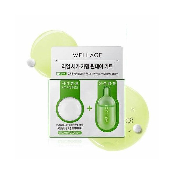 - Ingredients: 1) WELLAGE Real HA Cica Calming Capsule Sodium Hyaluronate, Algin, Hydroxypropyl Cyclodextrin, Madecassoside (0.74%), Asiaticoside (0.16%) 2) WELLAGE Real HA Cica Calming Solution Purified Water, Dipropylene Glycol, Propanediol, Butylene Glycol, Pentylene Glycol, Niacinamide, 1,2-Hexanediol, C12-14 Pareth-12, Inositol, C12-14 Pareth-7, Trehalose, Centella Asiatica Extract, Sodium Citrate, Ethylhexylglycerin, Citric Acid, Adenosine, Coptis Chinensis Root Extract, Glycerin, Disodium EDTA, Melia Azadirachta Leaf Extract, Melia Azadirachta Flower Extract, Polygonum Cuspidatum Root Extract, Agrimonia Eupatoria Extract, Green Tea Extract, Chamaecyparis Obtusa Leaf Extract, Coccinia Indica Fruit Extract, Silybum Marianum Seed Extract, Aloe Barbadensis Flower Extract, Scutellaria Baicalensis Root Extract, Polygonum Cuspidatum Root Extract, Solanum Melongena (Eggplant) Fruit Extract, Perilla Frutescens Leaf Extract, Propolis Extract, Broussonetia Kazinoki Root Extract, Ocimum Sanctum Leaf Extract, Hydrogenated Lecithin, White Willow Bark Extract, Cimicifuga Dahurica Root Extract, Madecassoside, Matricaria Flower Extract, Rosemary Leaf Extract, Caprylic/Capric Triglycerides, Beta-Glucan, Curcuma Longa (Turmeric) Root Extract, Corallina Officinalis Extract, Sodium Stearoyl Glutamate, Centella Asiatica Leaf Extract, Sucrose Laurate, Asiaticoside, Evening Primrose Extract, Histidine, Glycine, Serine, Arginine, Lysolecithin, Tocopherol, Benzyl Glycol, Hydrolyzed Glycosaminoglycans, Sodium Hyaluronate, Sodium Hyaluronate Crosspolymer, Hydrolyzed Hyaluronic Acid, Hydroxypropyltrimonium Hyaluronate, Sodium Acetylated Hyaluronate, Hyaluronic Acid