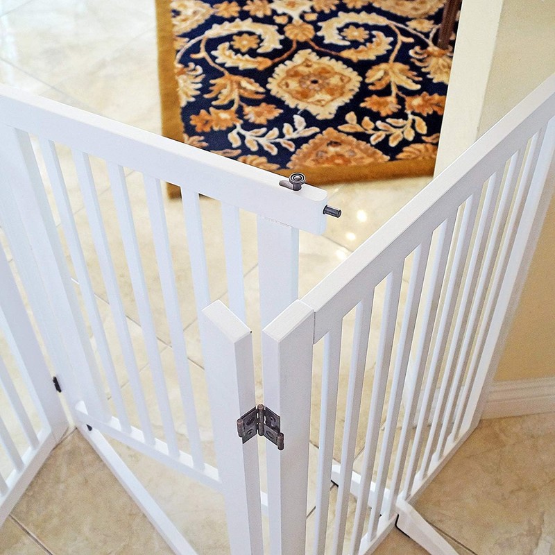 • FIT 0.75" THICK GATE - There is a slot, about 0.75 inches, in the middle of the item. The rubber pads which besides the slot increase adsorption and friction between support feet and pet gate, keeping the pet gate upright