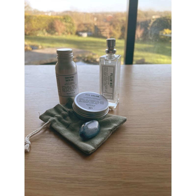 Wellbeing Kit, Organic Bath Oil, Eye Cream, Rose Quartz Stone, Pillow Mist, Vegan, Handmade in UK