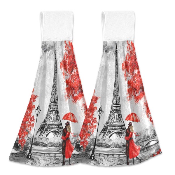 WELLDAY 2 Pcs Hanging Hand Towels Soft Absorbent Red Paris Couple Towel for Kitchen Bathroom