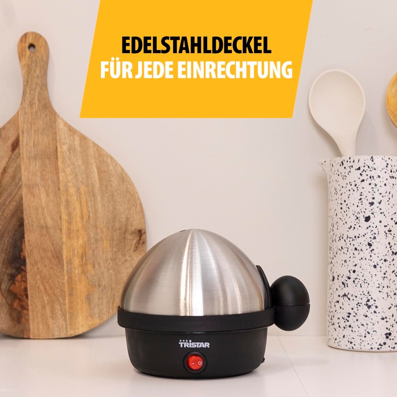 - The egg boiler is equipped with a removable egg container and a measuring cup with integrated egg picker
