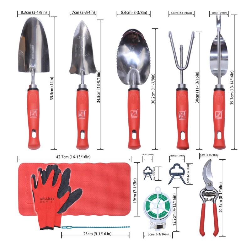 Wellmax Garden Tools Set of 12 with Gardening Gloves, Pruning Shear and 7 Piece Stainless Steel Hand Digging Tool Heavy Duty kit