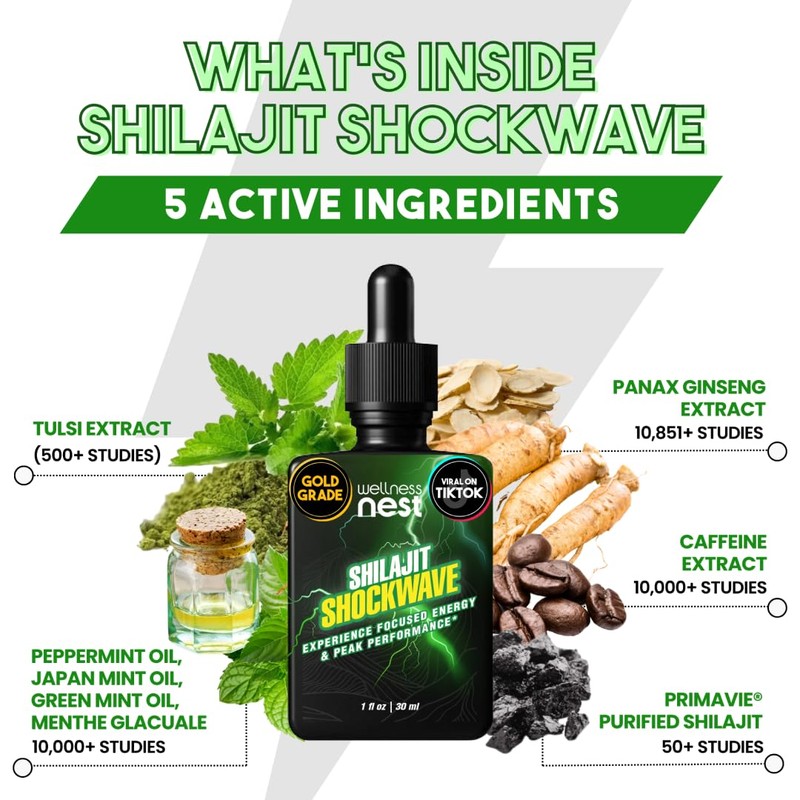 Wellness Nest Shilajit Shockwave Drops: Energy Drops, Focus Drops - Pure Himalayan Shilajit with Natural Tulsi, Panax Ginseng, Peppermint, Japanmint Supercharge Your Day - 30 Servings