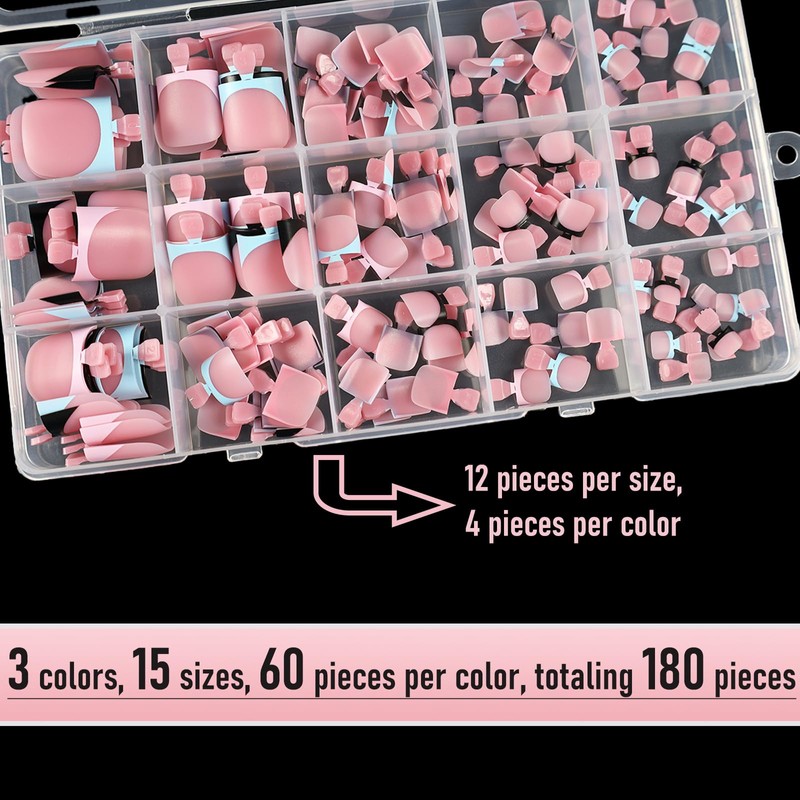 - 3 Colors French Tip: Pink press on toenails with pink, black, blue french tip,15 sizes, 60 pieces of each color, total 180 pieces