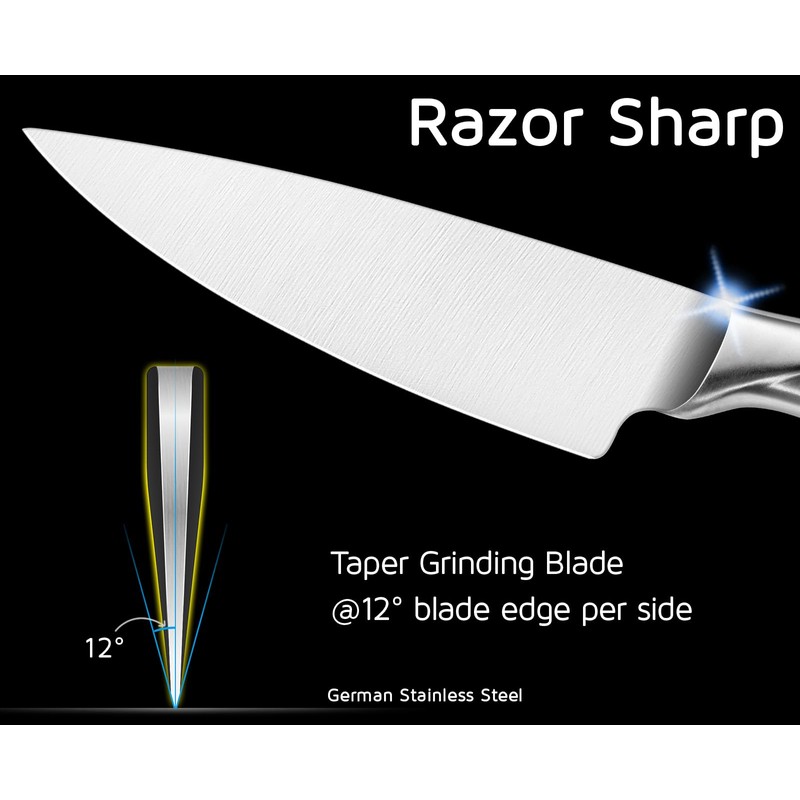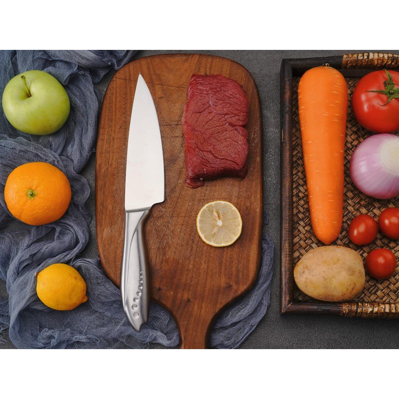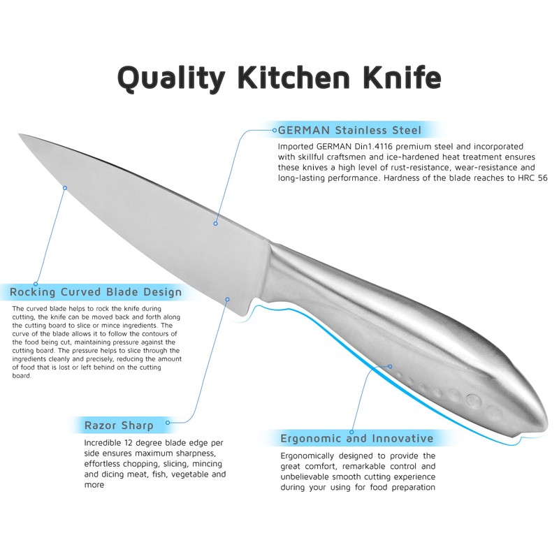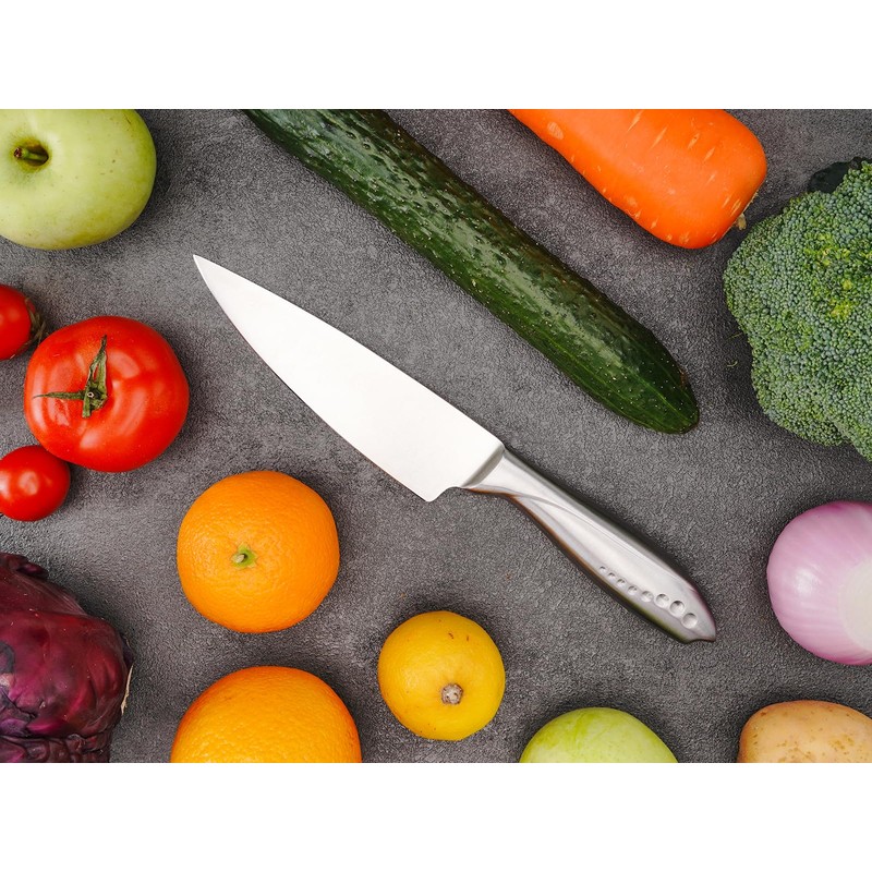 - 【ERGONOMIC PATENTED HANDLE】This versatile small chef’s knife handle is made by stainless steel for life-long durability. The patented whole stainless steel handle increases the extra strength and durability. Ergonomically designed handle shape and construction ensures a secure and comfortable grip.