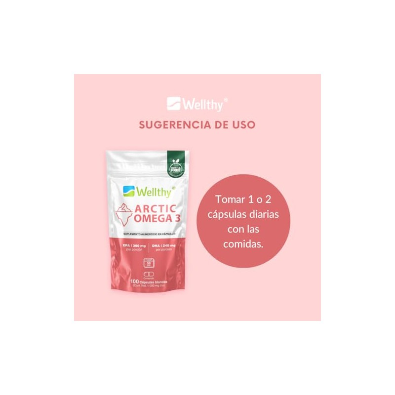 Wellthy Acrtic Omega 3 Softgel 100 Cpsulas. 100 Aceite de Salmn, 360mg EPA, 240mg DHA, 50 Dias de Consumo, Hecho en Planta Certificada, Bottle Free.