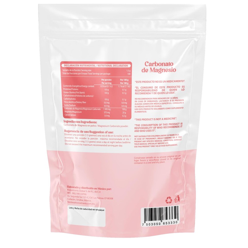 - Fácil integración: El carbonato de magnesio es versátil y puede mezclarse fácilmente en agua, jugos o smoothies para un consumo sencillo.