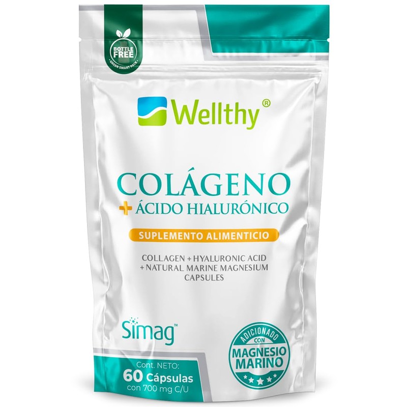 Wellthy Colágeno Hidrolizado + Ácido Hialurónico 60 Capsulas. 100% Natural, Colágeno Español, Reforzado con Magnesio Marino Francés SIMAG, VCaps Cápsulas Veganas, Bottle Free.