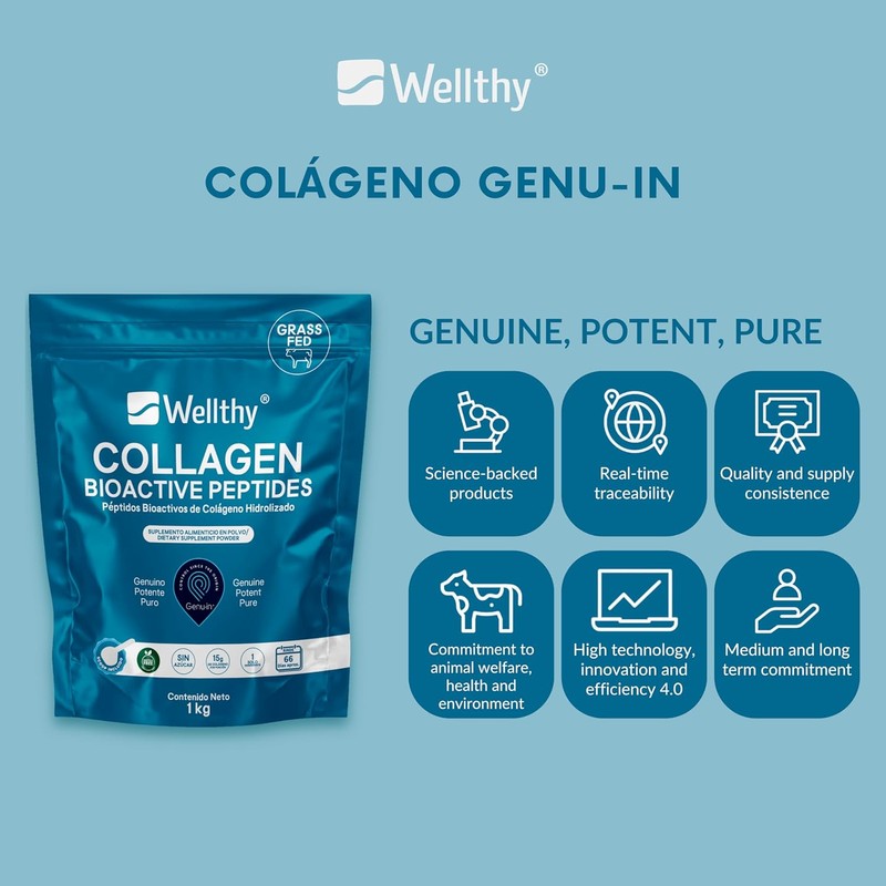 Wellthy Colageno Hidrolizado Puro 1kg. Péptidos de Colágeno Bioactivos Genu-In®, 66 Porciones por Envase, 1 Solo Ingrediente, SIN Azúcar, Scoop Incluído, Bottle Free.
