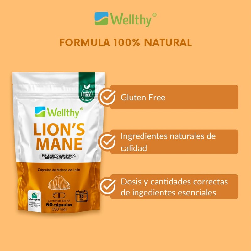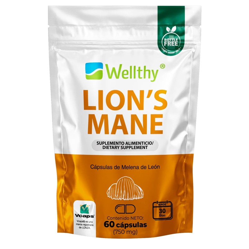 Wellthy Lion’s Mane 60 Cápsulas. Hongo Melena de Leon 750mg c/u, 1500mg por Porción, 30 días de Consumo, VCaps Cápsulas Veganas, Bottle Free.