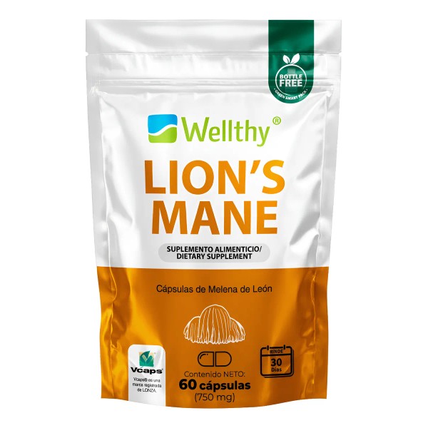🦁💡 Wellthy Lion’s Mane – 60 Cápsulas | 750mg por cápsula, 1500mg por porción | 30 días | Fórmula Vegana y Bottle Free