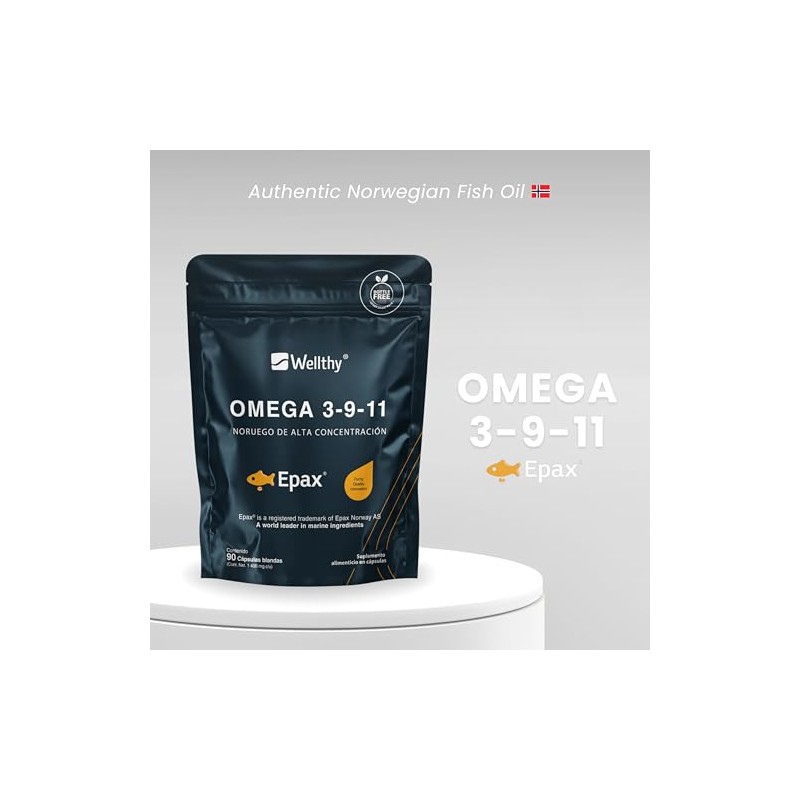 Wellthy Omega 3, 9, 11 Epax 90 Cpsulas. El aceite de pescado Noruego Epax es ultra concentrado en EPA 1000mg, DHA 400mg, Omega 9 180mg. Bottle Free.
