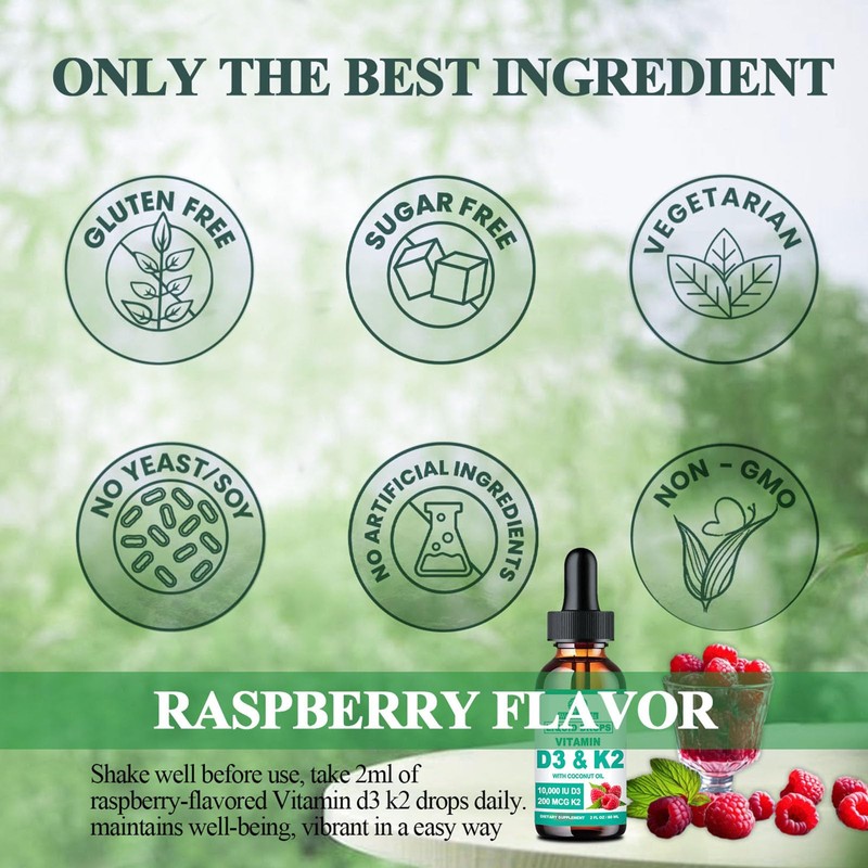 - EASY TO SWALLOW & EASY TO ABSORBED IRON DROPS: Not a fan of swallowing large pills? Our k2 d3 vitamin supplement in liquid forms with raspberry flavor absorbed 5X faster and stronger by your body than vitamin d3 k2 pill, d3 k2 capsules, vitamin d3 k2 sofegels, and giving it an excellent absorption rate of 98%, higher than other forms. Moreover, it's simple way to take vitamin to your daily routines, just take 2 full droppers with coffee, water,drink or salad...Better promoted the regular and comfortable elimination of body toxins