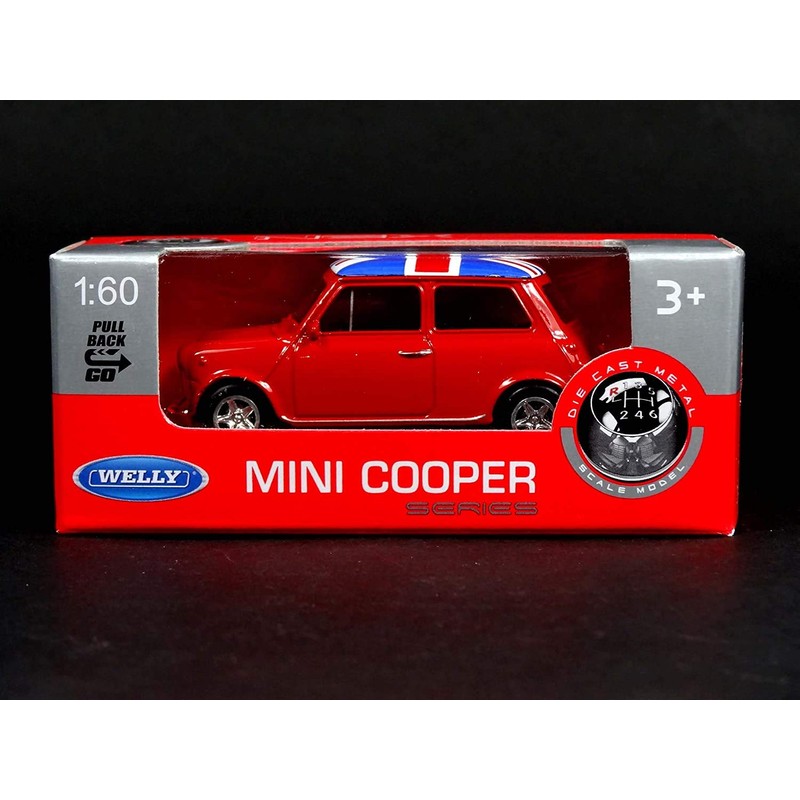 Welly Mini Cooper Mini Model (Red) with Union Jack Top Made of Die Cast Metal and Plastic Parts, Pull Back & Go Action Toy