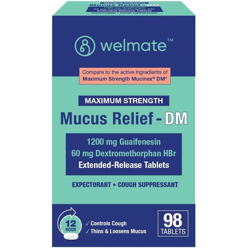 WELMATE - Maximum Strength Mucus Relief DM (98 Servings) - 1200mg Guaifenesin + 60mg Dextromethorphan HBr - 12-Hour Expectorant, Cough Relief - 98 Extended-Release Tablets