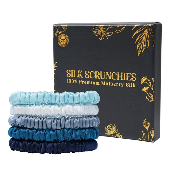 WELROG Set of 5 100% Mulberry Silk Scrunchies for Women Silk Hair Scrunchies for Girls Elastic Silk Hair Bobbles Without Marks Silk Hair Bobbles for Smooth Hair