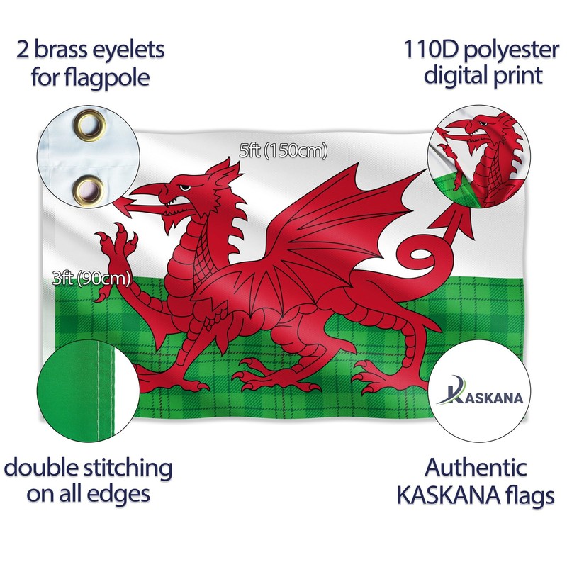 • Specification: Package contains 1 Tartan Welsh Flag 5x3ft (150x90cm) with 2 brass grommets.