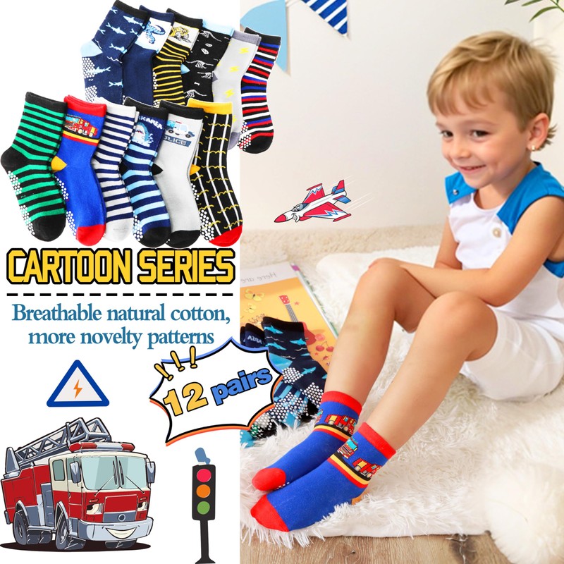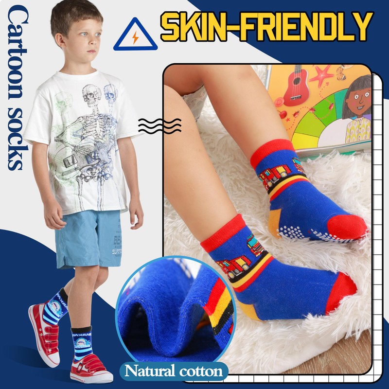 - 5 sizes: There are 5 sizes of these non-slip socks to choose from: 19-22 (for baby 6-12 months), 22-24 (for children 1-3 years), 24-26 (for children 3-5 years), 26-28 (for children 5-8 years), 28-34 (for children 9-14 years). Kids in these ages can enjoy these cute funny socks in all seasons. The cartoon stopper socks are perfect gifts for active boys, toddlers and children.