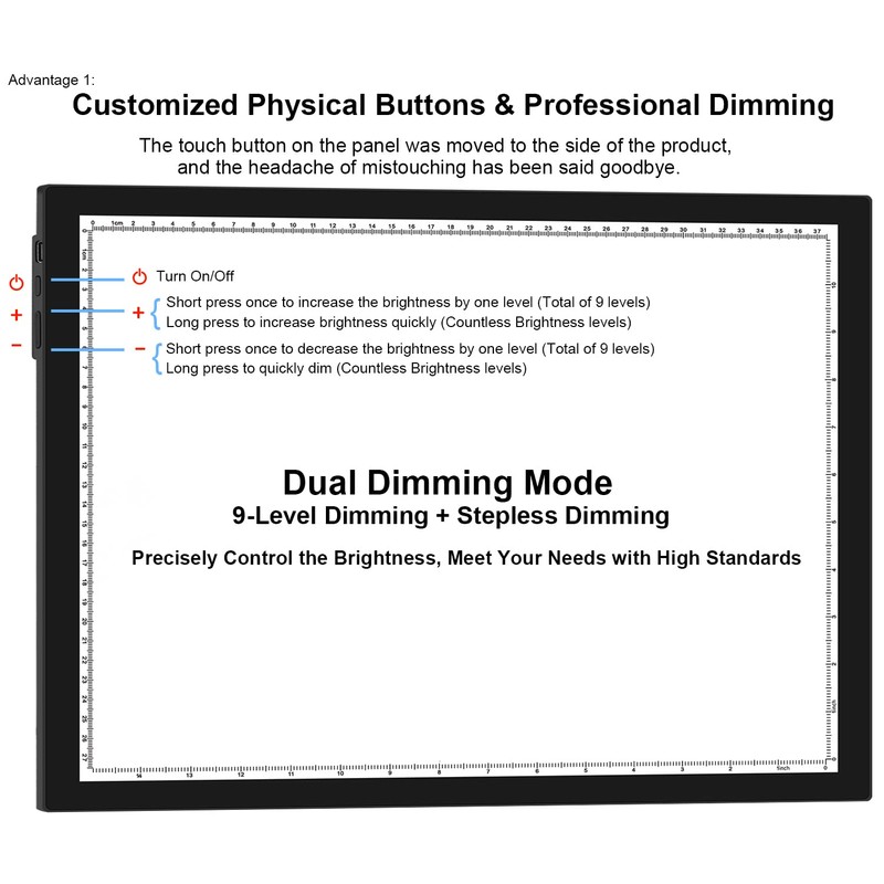 - 🖤【Side Physical Buttons, Professional Dual Dimming Mode】The light board A3 switches and dimming buttons on the panel are moved to the side of the product, which completely avoids the headache of mistakenly touching. Short press +/- once to brighten/dark one level of brightness, this mode supports 9 brightness levels; long press +/- to quickly brighten/dark, this mode supports countless brightness levels.