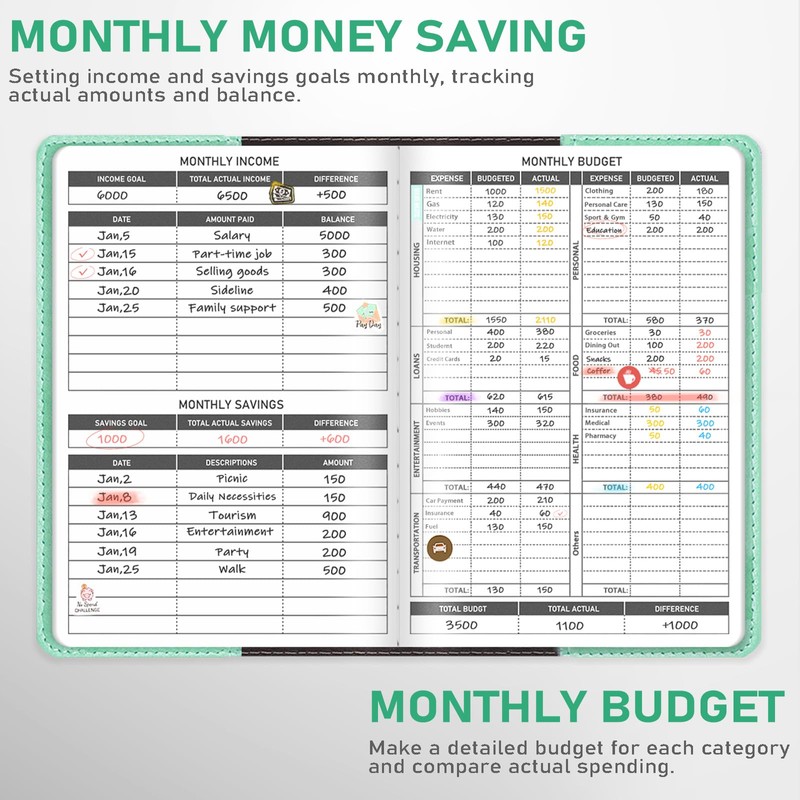 - 【Ample Planning Space & 12 Months of Use】Each month features a full-page calendar for detailed monthly planning, providing sufficient space to set financial goals and mark important dates on bills. It facilitates easy tracking of income, expenses, and savings, monitoring daily expenditure details. At the end of each month, review and analyze the balance, and with dotted grid pages for ideas and notes, it's very useful for adjusting plans for the next month.