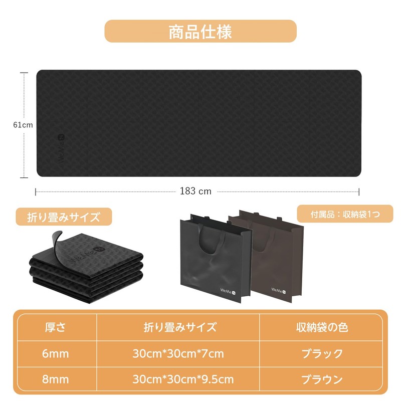 WeMe Yoga Mat, Folding, 0.16, 0.2, 0.3 inches (4 mm), 0.2 inches (6 mm), 0.3 inches (8 mm), Exercise Mat, TPE Material, Anti-Slip, Non-Toxic, 72.0 x 24.0 inches (183 x 61 cm), Pilates Mat, Lightweight