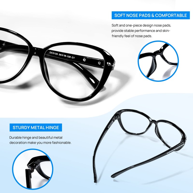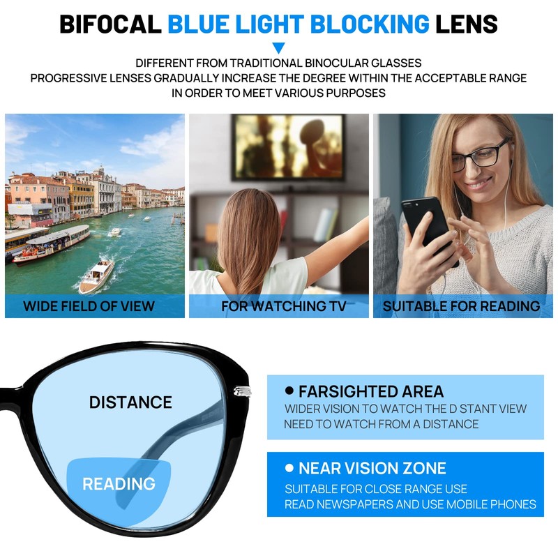 - Bifocal Readers 1.75 & Don’t have to take off for Distance : Standard progressive bifocal blue light blocking reading glasses for distance range, can help you get better visual experience. Moving the line of sight from top to bottom, you could easily see the far and near clearly without having to keep taking them off or putting them back on.