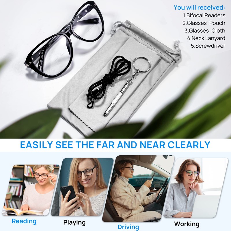 - You Will Receive : Bifocal Reader 1.75 *1, Glasses Pouch*2, Glasses Cloth*1, Screwdriver*1 and Neck Lanyard *1.