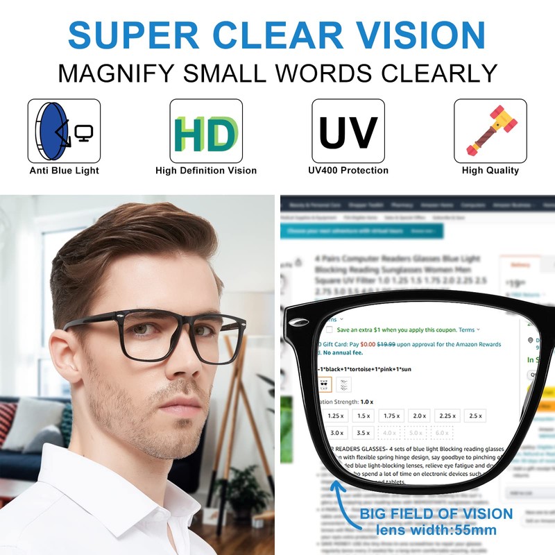 - EFFECTIVELY BLOCK HARMFUL BLUE LIGHT: High quality reading glasses lens filter blue light from computer, phone, laptop. Relieve eyestrain, headache caused by using electronic viewing devices.