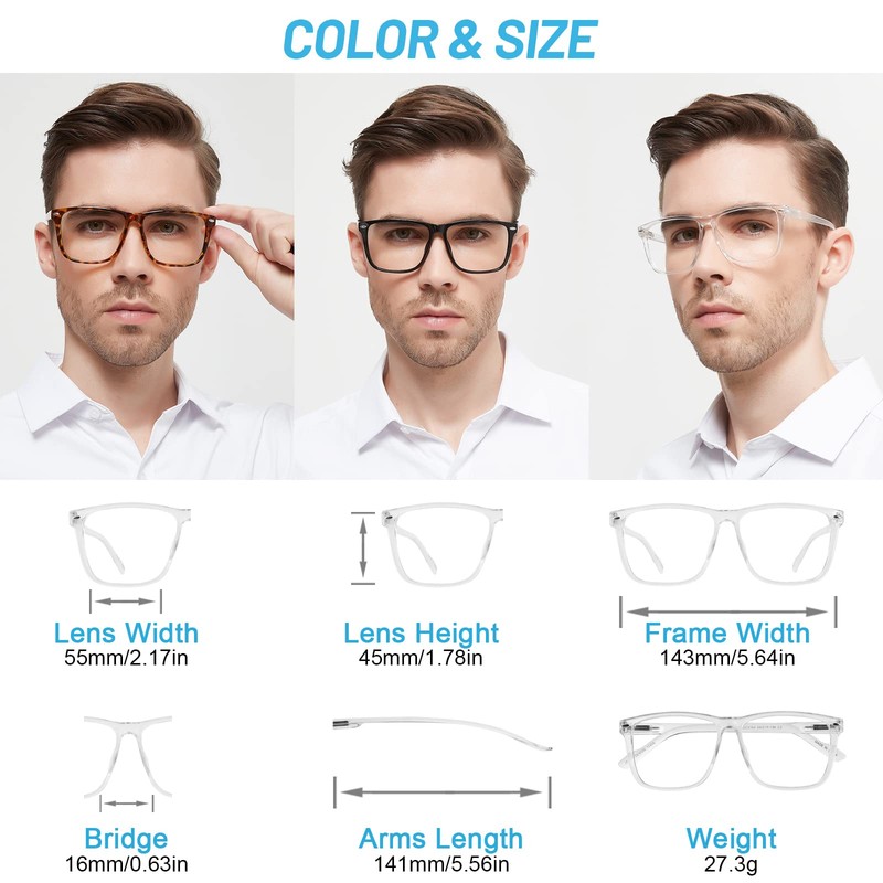 - Big square bi-focal readers sizes & strength - Frame Width - 143 mm(5.64"), Lens Width - 55 mm(2.17"), Lens Height - 45 mm(1.78"), Bridge Width - 16 mm(0.63"), Arm straight-line length-141 mm(5.56"). Dual focal magnification strength varies from 1.0x 1.25x 1.5x 1.75x 2.0x 2.25x 2.5x 2.75x 3.0x 3.5x for your selection.
