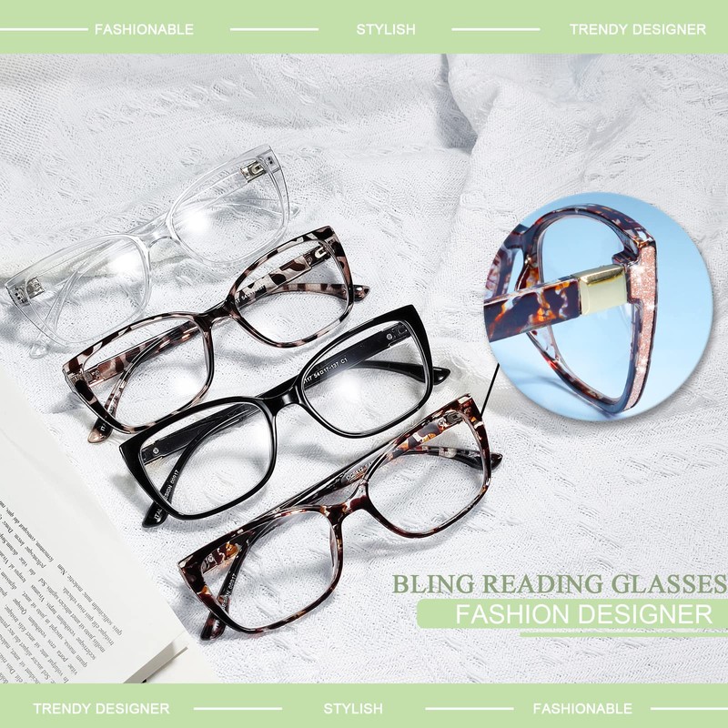 - Bling Reading Glasses 3.00 : The designer readers for women with shiny sparkle glitter on the side, bling bling light appears when turn your head, to make ladies stylish and cool. Cat eye bling eyeglass frames have gold metal decoration, combined with sparkling glitter design, to stand shining in the world you love.