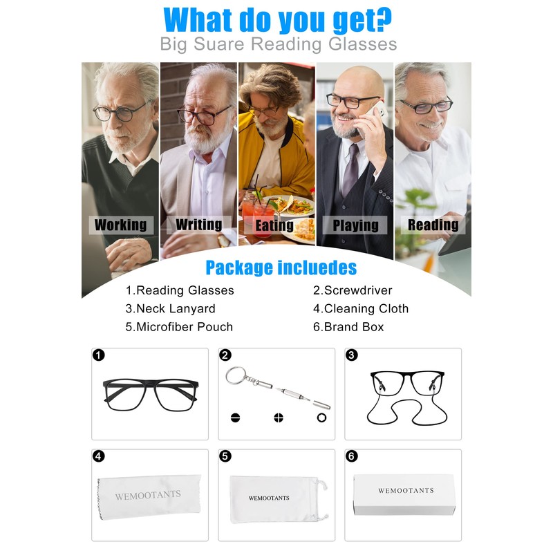 VALUABLE - WEMOOTANTS reading glasses for men are superbly crafted at a reasonable price. Wearing our light readers at home, in your car, at the office, or wherever you need them, means you can choose your style, and protect your eyes!