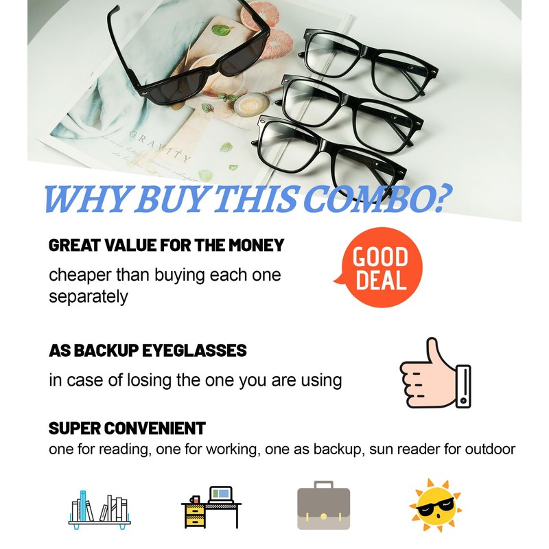 - EXCELLENT VALUE OF 4 PACKS - 1. Good value for money: A set of 4 pairs at a good price cheaper than buy them separately. 2. One combo for both indoor and outdoor: 3 packs reader glasses plus 1 pack sun readers ideal for reading or working in home, office, cafe, yard, poolside or beach. 3. Great convenience: Enough to put them in different place or leave extra pair as back-up. 4. Great choice of decent gifts to lover, friend, teacher, dad and mom.