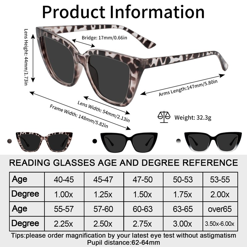 - Trendy Design & Sturdy Frame : Iconic cat-eye shape features durable material in tortoise for a striking and sophisticated look. A little horn style edge looks more cute and stylish. Strong metal hinges connect these sun reading glasses firmly and ergonomic cambered nose pads fits your nose snugly.