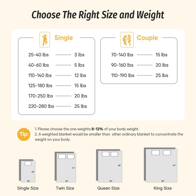 - Choosing the Right Weight: We suggest that you start with a blanket which weighs approximately 8%-12% of your body weight. Usually, it takes 3-5 days to adjust to the weight of this blanket. A quick note: a weighted blanket would appear smaller than a traditional one since its weight needs to concentrate on your body, so the blanket doesn't hang over the edge of the bed