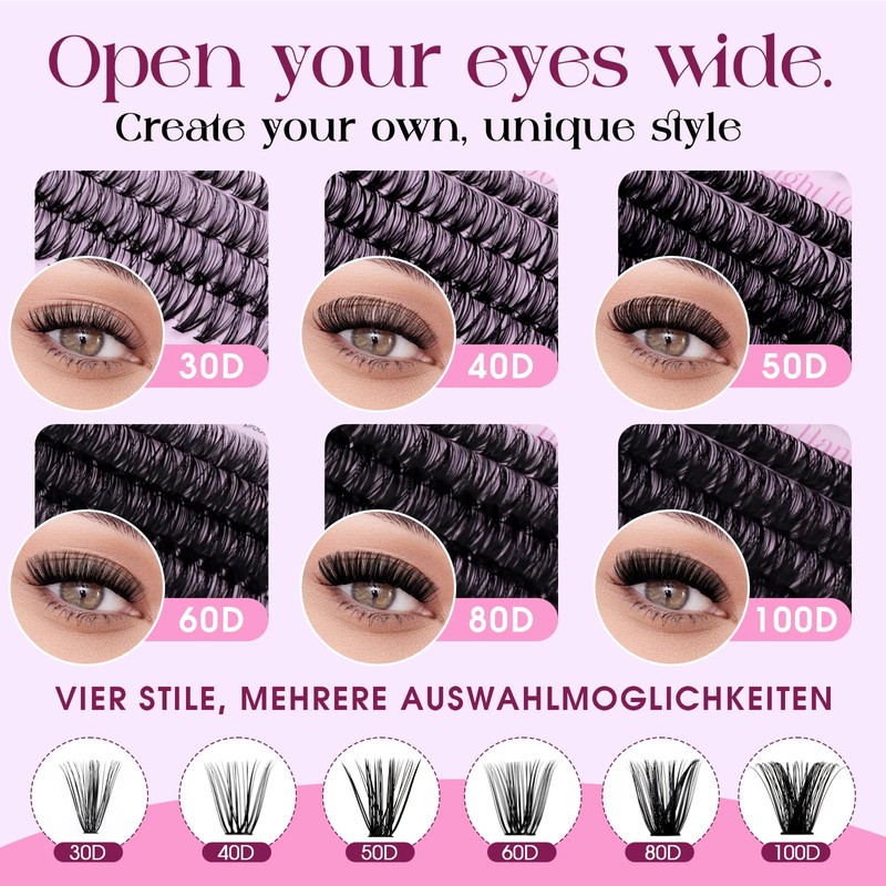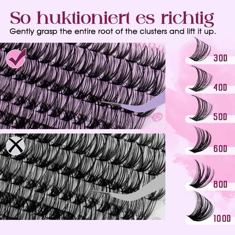 - Value Eyelash Cluster Set:This eyelash extension includes 30D+40D+50D+60D+80D+100D/30D+40D+60D+80D eyelash clusters, D/C curvature, length of 10-16mm.Whether it's for cat-eye eye make-up, natural eye make-up, or thick and fluffy eyelash extensions, one tray of eyelash clusters is enough to satisfy all your eyelash extensions DIY needs