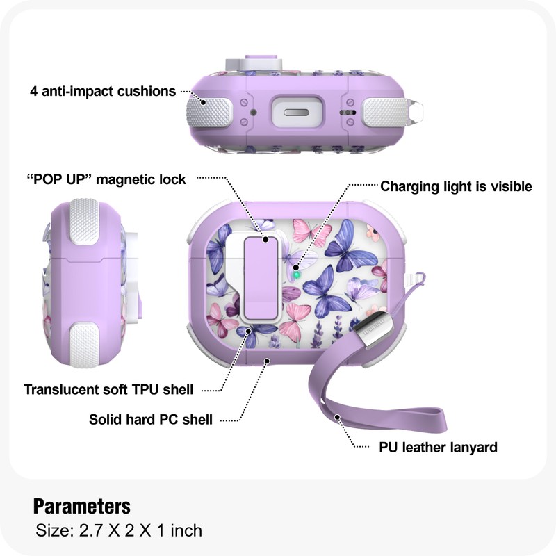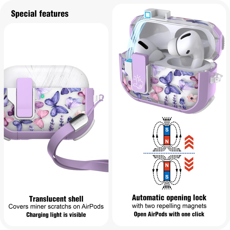 wenew WENEW Case for AirPods Pro & Pro 2 Case Cover Secure Lock Automatic Snap Switch Clip Cleaner Kit Lanyard Women Stylish Hard Shell Full Body Front LED Visible (Purple Butterfly, AirPods Pro & Pro 2)