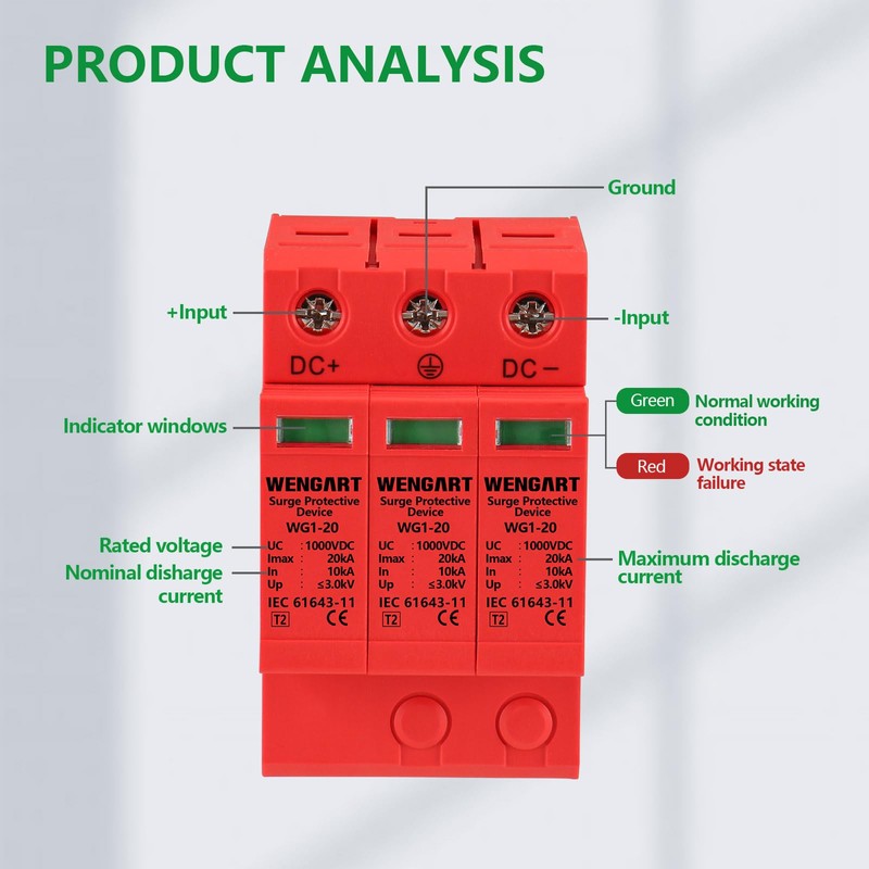 Wengart Surge Protection Device, DC1000V 3P 10-20kA 36mm DIN Rail Mount, Low Voltage Protection Device for Lightning Protection, Power Distribution and Control Devices