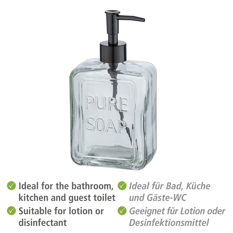• PURE SOAP - The rectangular glass pump dispenser is sturdy and generously constructed. Genuine and unadulterated, the angular design Pure Soap dispenser from Wenko keeps soap and lotion always at hand