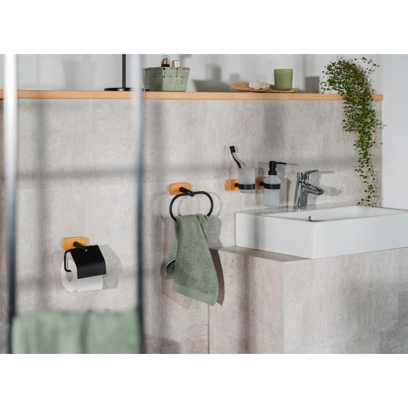 - High quality: the ring is made of stainless steel and finished with a black lacquer. The wall panel is made of natural bamboo, which radiates comfort and warmth - so the bathroom accessory blends stylishly into the existing decor.