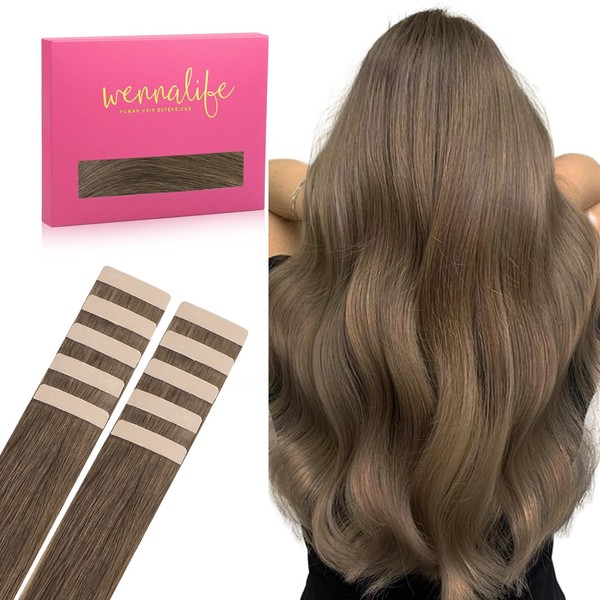 WENNALIFE Tape in Hair Extensions Human Hair Light Ash Brown Tape in Extensions, 10pcs 30g 24 inch Remy Invisible Tape Ins Straight Colored Soft Real Human Hair Tape in Extensions Refill Set